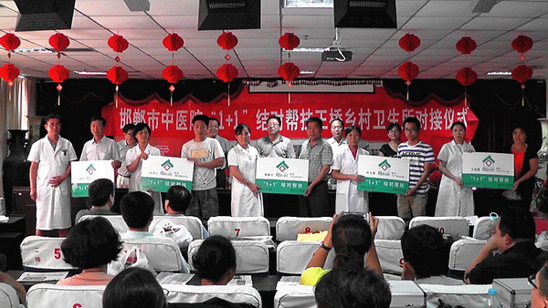 8月27日,我院“1+1”结对帮扶馆陶县王桥乡村卫生室暨健康小屋挂牌对接仪式在馆陶县中医院举行。馆陶县副县长王春生,县卫生局局长李章民,县中医院院长武洪民,市中医院党委书记、院长高社光,副院长张恒云、王莉、魏勇军、王红霞、纪检书记李国军以及医院40名帮扶专家和该乡40个村卫生室的负责人参加了启动仪式。