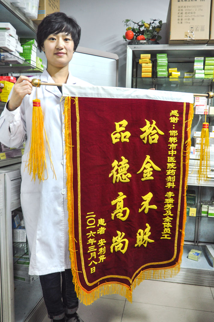 201638日下午3点左右,我院药剂科职工李瑞芳在门诊楼一层卫生间内捡到一个手提包,打开一看,发现里面装有药品,大量现金和一部全新手机,当时李瑞芳只有一个念头,这十之八九是患者的治病钱,一定要尽快将包交到失主手中。经过清点,包内有现金二万余元,无卡手机一部、大量药品以及若干纸片。可是手机内没有发现任何联系方式信息,只有几张纸片上模糊记录着一些电话。于是,她开始逐个拨打电话,一番努力后成功联系到了失主。4点左右,失主来到门诊大厅,李瑞芳找到导诊台的护士梁莹莹,一起为失主清点财物并亲手将包交到失主手中。失主接过失而复得的包显得意外而又惊喜,执意要重谢李瑞芳,李瑞芳说什么都不用,她说:“这是我应该做的,换成我们院任何一个人都会这样做的,让病人及时得到治疗,是我们共同的心愿”。原来,失主的姐姐长期患病,这一天她刚刚取出二万多的治病钱,准备来我院交住院费,谁知在慌忙中将手提包忘在了卫生间的衣帽钩上。多亏这救命的钱能及时找回,否则对她姐姐的病情真的是雪上加霜,为此失主特意送来表扬信和拾金不昧的锦旗。