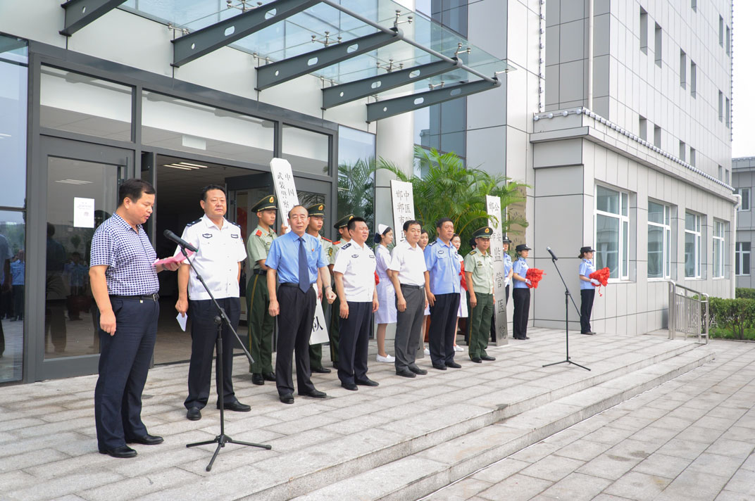 6月21日上午,邯郸市第一、第二、第三看守所正式合并新址,并举行了揭牌仪式,同时邯郸市中医院驻看守所分院、邯郸市公安局监管医院、武警邯郸市中队正式成立。副市长、市公安局党委书记、局长艾文庆,市卫生计生委党委书记、主任周海平,市中医院马登斌院长以及市检察院、市公安局、市武警支队官兵、市中医院医护人员代表等近200余人参加了揭牌仪式。 邯郸市中医院驻看守所分院、市公安局监管医院设置床位30张,配备医护人员10名、医技人员4名,同时配备了X光机、心电图机、彩超、常规生化化验等检查诊断设备。主要负责看守所在押人员的健康体检及在押期间的疾病治疗。市公安局监管医院的建立,选择与市中医院合作共建,是市领导及市卫计委领导对市中医院的信任,医院高度重视,上升到讲政治的高度,周密部署、合理安排,在短期内完成了人员、医疗设备设施、附属物品的配备,保证了正常工作的开展,得到了领导的认可与好评。