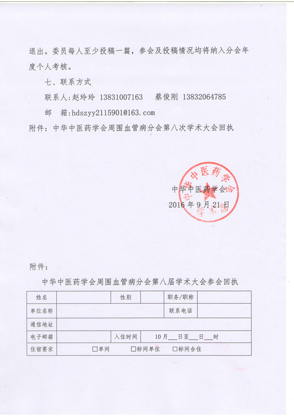 由中华中医药学会主办中华中医药学会周围血管病分会承办河北省中医药学会、邯郸市中医药学会及邯郸市中医院协办“中华中医药学会周围血管病分会第八次学术大会定于2016 10月28-30日在河北省邯郸市召开。会议通知如下: