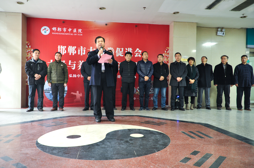 马登斌院长发表了热情洋溢的讲话,他说:“在这一阳始生的日子里,我们迎来了邯郸市太极拳促进会太极与养生文化研修基地在我院的成立。太极和中医是中华民族的传统瑰宝,我市也是太极拳的发源地。太极是集锻炼自身形体、呼吸吐纳、心理调节各方面于一体的运动。运动养生是中医治未病的一个范畴,也称“体疗”,运动能强身健体、减重塑形,提高机体免疫力,促进和改善脏腑自身血液循环,保持旺盛的生命力,远离许多疾病的侵扰,再应用中医药在保健、养生、预防、治未病的特色优势,使群众不得病、少得病,提高民众的健康水平和幸福指数。