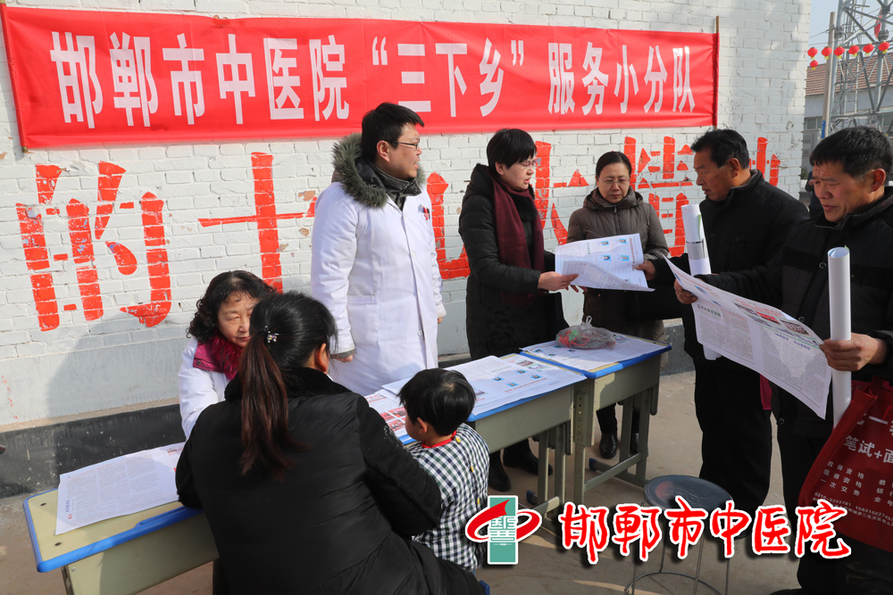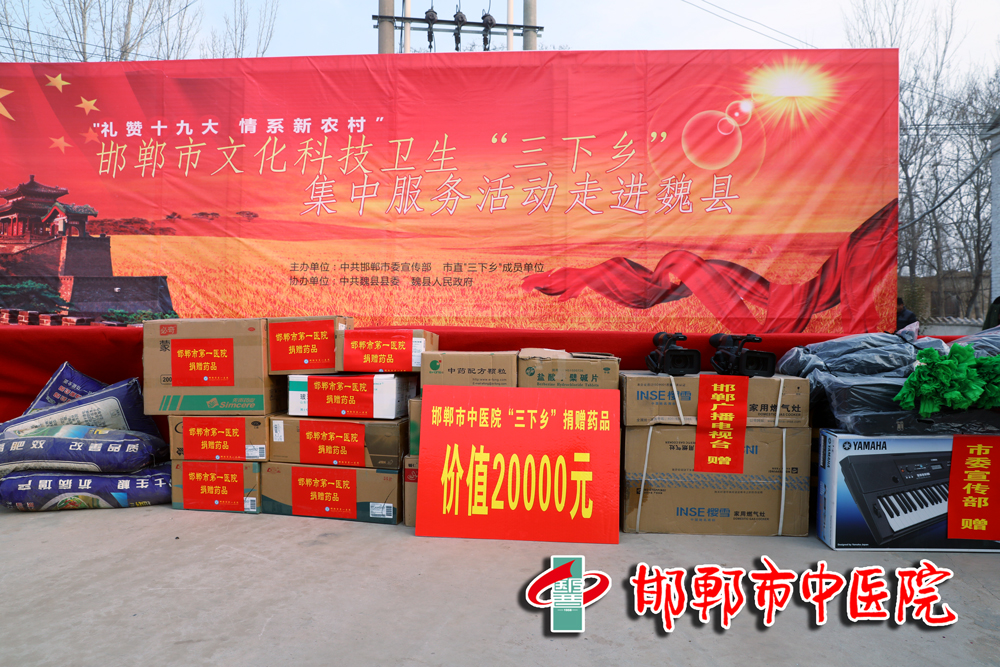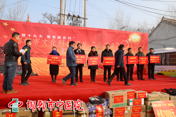 1月19日上午,“礼赞十九大 情系新农村”邯郸市文化科技卫生“三下乡”集中服务活动走进魏县,在魏县大马村乡二马村隆重举行。我院精心组织心肺科、老年病科、脑病科等科室专家,由王莉副院长带队,赴魏县为当地居民提供义诊、健康咨询服务,发放健康宣教材料300余份,并向当地捐赠价值2万余元的基层实用药品。专家医疗队还在当地卫生室工作人员的带领下,到部分有需求的群众家中提供健康服务,并免费为其赠送所需的药品。