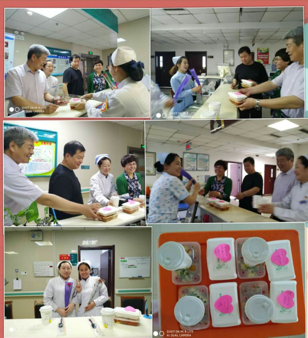 ★“爱心午餐”送天使活动。5月12日中午,马登斌院长,王莉副院长,纪委李国军书记,护理部林芸主任等院领导,到临床一线,为值班护理人员送去爱心午餐和鲜花,并送上节日的祝福和问候,对她们的辛勤工作及无私奉献表示感谢。护士们深切的感受到院领导的关怀和爱护,对领导的慰问表示衷心的感谢!护士们纷纷表示:今后将继续弘扬南丁格尔精神,以精湛的护理技术和高尚的职业道德守护生命健康。(护理部 供稿)