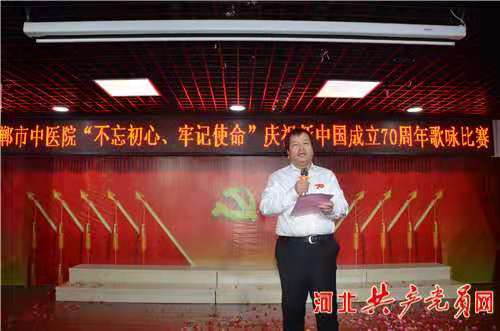 现场20支参赛队伍用歌声表达了对党的无限热爱、对伟大祖国的美好祝福,展示了全院党员干部职工“不忘医疗为民初心、牢记健康服务使命”的初心和使命。比赛中,各科室精心准备,服装整齐、精神饱满、歌声嘹亮,极具感染力。大家演唱了《没有共产党就没有新中国》、《年轻的朋友来相会》、《今天是你的生日》、《大中国》、《红星闪闪》、《爱我中华》、《中国中国鲜红的太阳永不落》等等脍炙人口的歌曲,通过深情的演唱,更加激发了大家对伟大祖国的热爱和祝福,引起了现场阵阵掌声。比赛结束后,党委书记、院长马登斌作总结发言:“举办‘不忘初心、牢记使命’庆祝新中国成立70周年歌咏比赛,是深入学习贯彻习近平新时代中国特色社会主义思想的举措,我们每个人都是新时代中国特色社会主义的建设者和参与者,我们一代又一代的中医院人要牢记救死扶伤的神圣使命,勤勉敬业、忘我工作、无私奉献,为传承发展中医药事业,推动医院各项事业发展做出积极贡献。希望全院干部职工在今后工作中,不忘初心,牢记使命,用习近平新时代中国特色社会主义思想武装头脑,继续践行社会主义核心价值观,弘扬“敬佑生命,救死扶伤,甘于奉献,大爱无疆”的职业精神,传承好我院“仁爱、诚信、谦和、敬业”的院训精神,坚持全心全意为人民服务的宗旨,用精湛技术、优质服务回馈人民,为健康中国建设谱写新篇章。最后,大家挥舞手中的国旗,一起高唱《歌唱祖国》,整场活动的气氛被彻底点燃,通过歌唱表达了全院干部职工奋进新时代、热爱祖国母亲、投身医疗事业的激情和责任,向新中国成立70周年献礼。