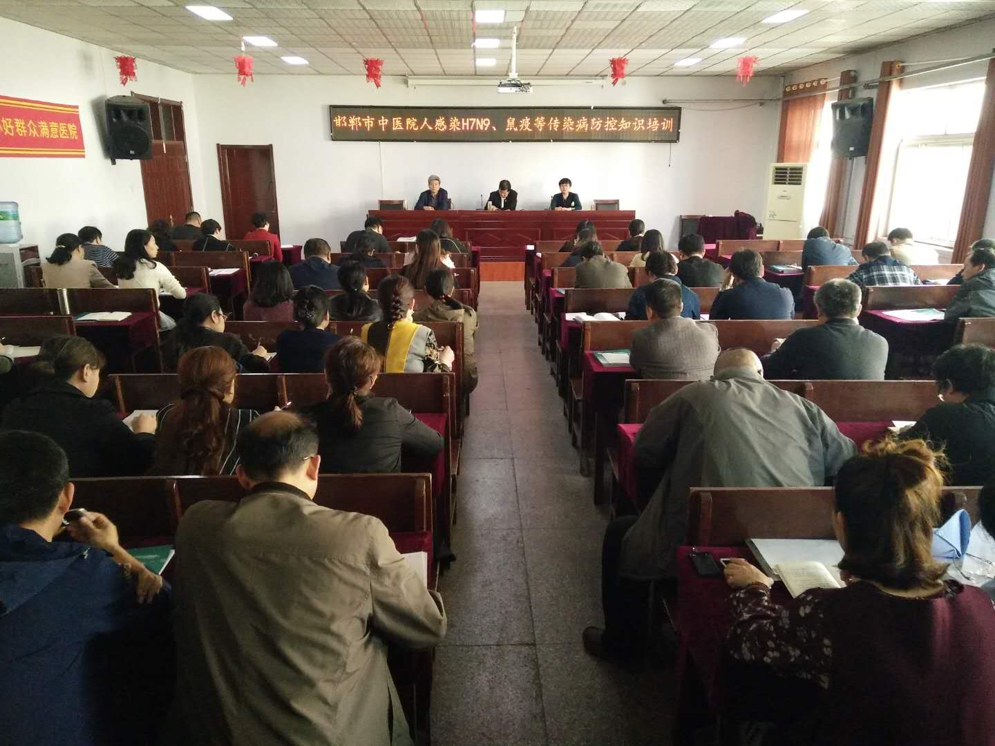 为贯彻全省卫生计生工作会议精神,落实【关于进一步做好人感染H7N9、鼠疫防控工作的通知】,4月11日下午,我院在四楼学术报告厅举办人感染H7N9、鼠疫等传染病防控知识培训。院领导班子、全体临床、医技科室主任、护士长、职能科室主任80余人参加了本次培训。疾控科杨晓庆科长从人感染H7N9、鼠疫等传染病现阶段流行趋势、临床表现、诊断标准、治疗原则和防控工作重要性等方面对全体人员进行了培训,强调全院要高度警惕,着力提高疫情应对能力和诊治防控水平。马登斌院长做了重要讲话,倡导全体员工健康文明的生活方式,提高群众健康意识和防病能力,并将防控意识和知识有效运用到日常工作中,动员全社会共同参与,扎实做好爱国卫生及传染病防控工作。