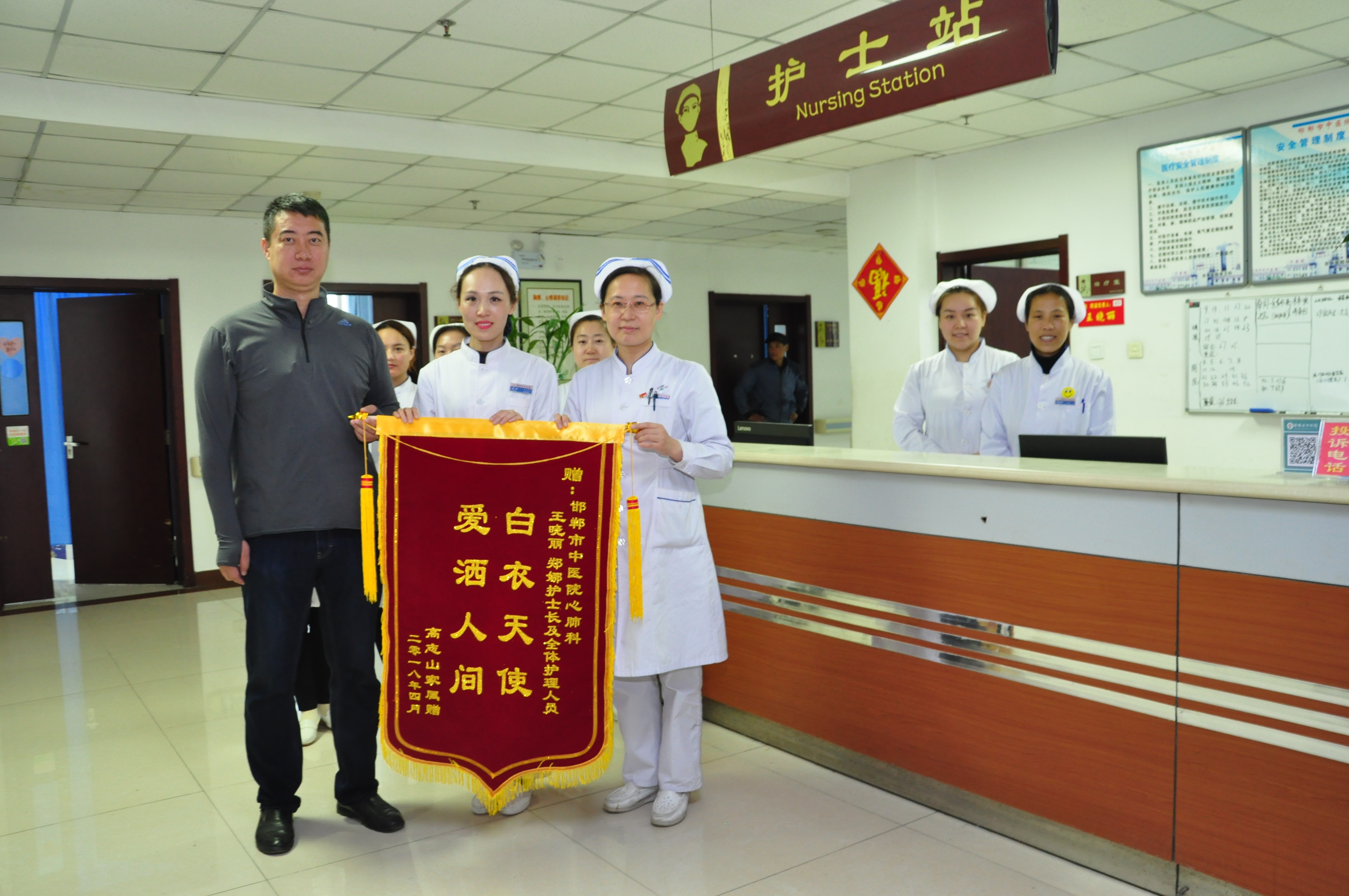 4月13日上午,患者高某某家属专程来到市中医院心肺科,为科里的赵自冰副主任及其医生送上写有“医德高尚暖人心,医术精湛传四方”锦旗一面;为王晓丽、郑娜等护理人员送上写有“白衣天使,爱洒人间”的锦旗一面,以表达该科全力抢救其亲人的感激之情。 原来,4月8日上午,患者高大爷因胸腹部不适来我院就诊,主诉胃部难受。负责分诊的门诊部王洪霞护士长根据经验判断,患者像是心脏方面的疾病,随即将患者带至心肺科就诊。接诊的李艳艳主任医师通过心电图诊断患者为急性间璧心肌梗死,在请示了科里赵自冰副主任后,并经征得患者家属同意后,科里马上联系导管室为该患者进行手术。赵自冰主任带领他的医护团队,以最快的时间为病人做了急性冠脉介入治疗,挽救了患者的生命。 冠脉介入治疗的特点一个字“快”,患者病情变化快,术者决策要快,用药操作快,抢救速度快,治疗效果快。从患者入院到抢救成功,他们仅用了90分钟。此事在医院迅速传开,心肺科医护人员被赞为“和死神赛跑的人”。(心肺科 宣传科)