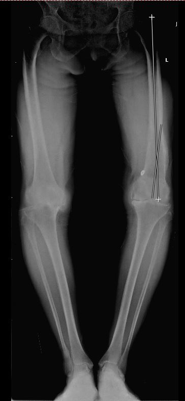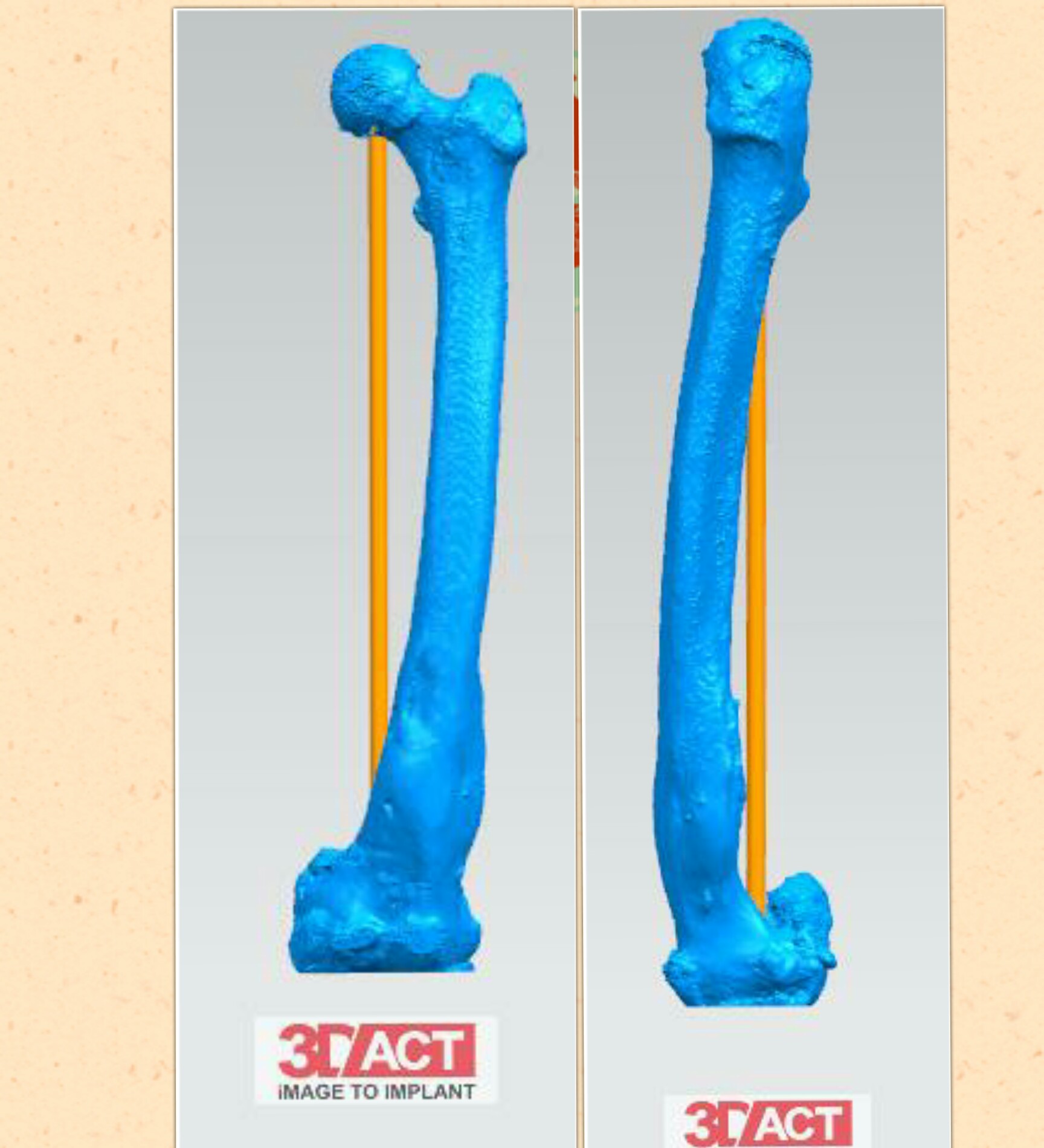与对侧股骨对比,患者左侧股骨存在内翻畸形 重建后的股骨3D模型与模拟力线